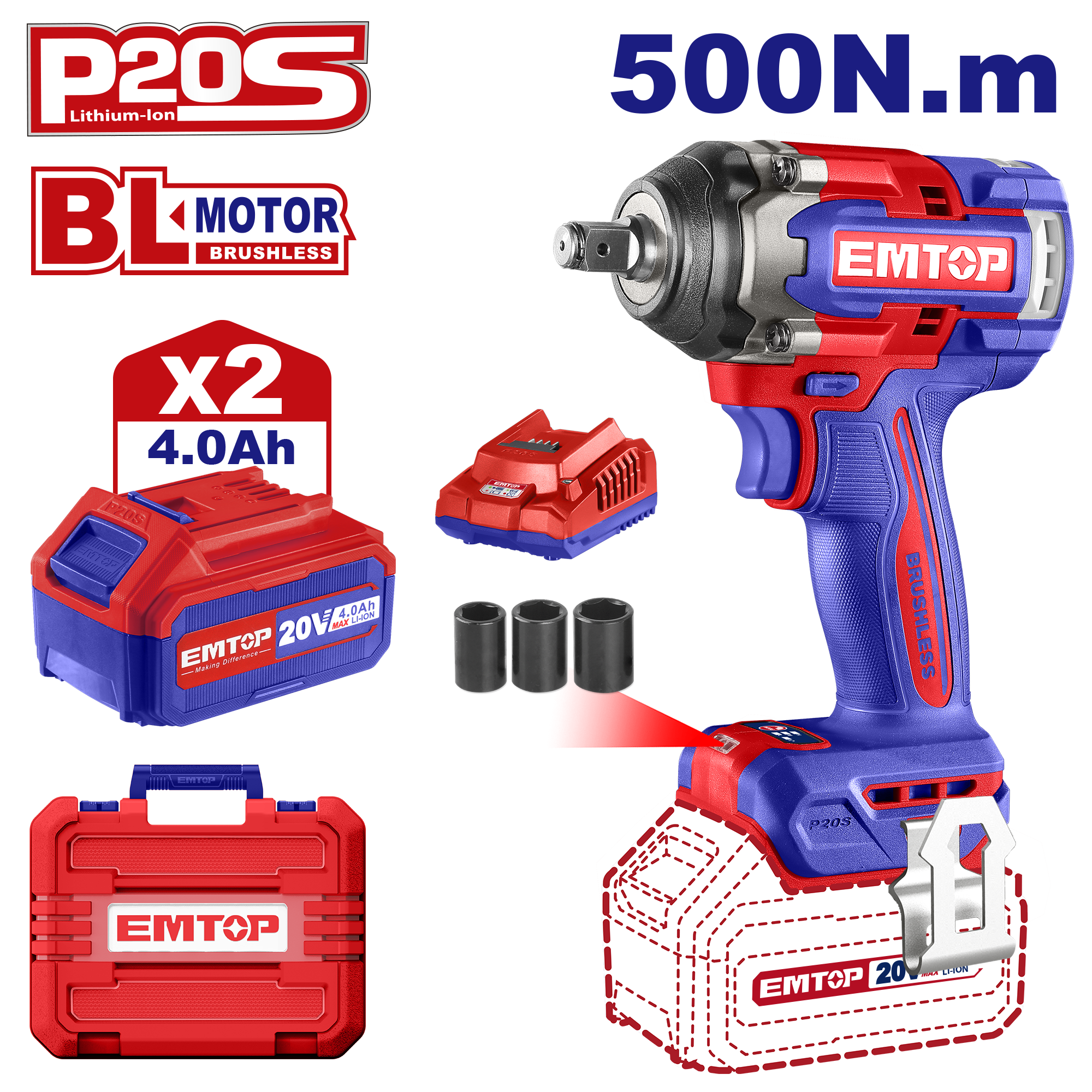 Bežični udarni odvijač ECIWL2050 Emtop sa 2 litijumske baterije od 4 Ah i motorom bez četkica. Ima  obrtni moment od 500 Nm pri zavrtanju i 650 Nm pri odvrtanju, LED radno svjetlo i kao dodatak 3 nasadna ključa (21, 22, 24 mm). Dolazi sa kutijom za skladištenje i transport.